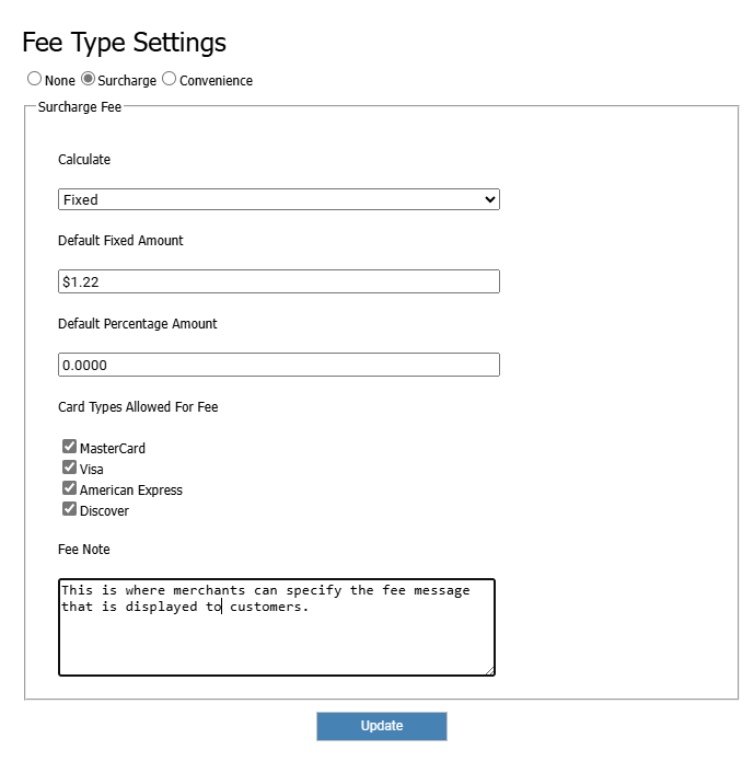 Surcharges and convenience fees are integrated into multiple Easy Pay platforms for a coherent approach to fee processing. The first step is to configure the merchant fee settings using the client admin portal.