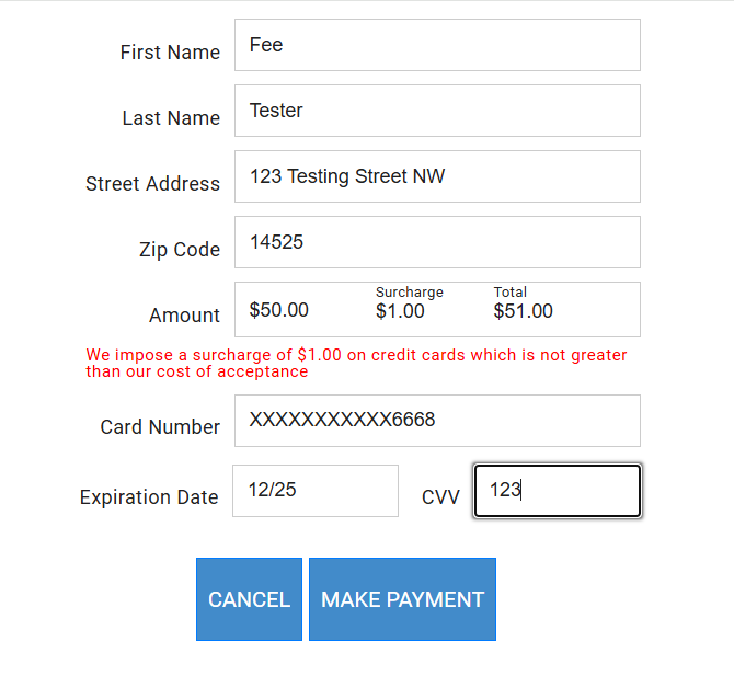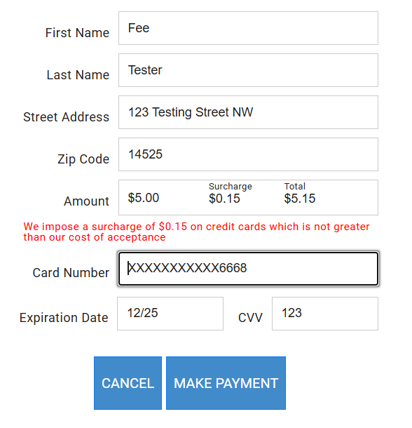 The PayForm widget is a customer facing web form for securely collecting payments. The fee amount and notification message are clearly visible for customers to see.