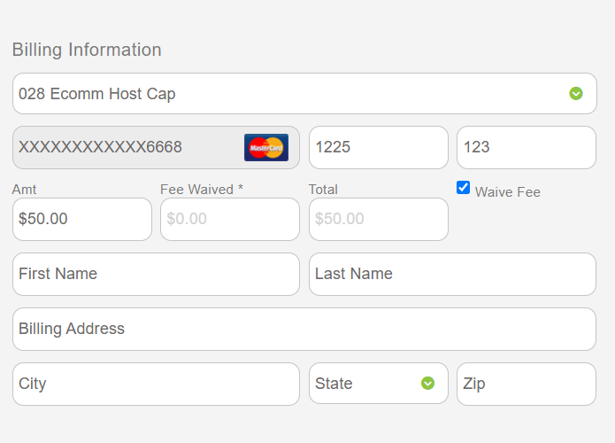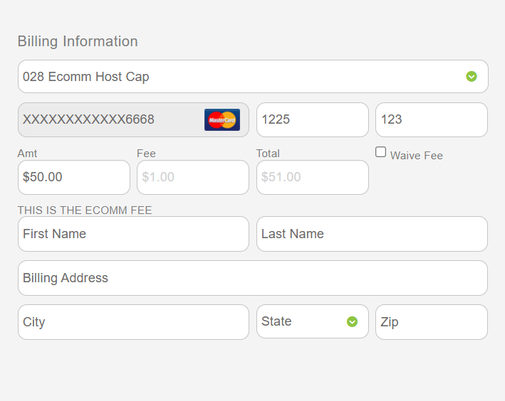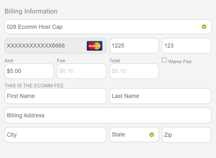 The Virtual Terminal system will also ensure that fee amounts do not go over the allowed 3% limit imposed on fees. In the sample below, the fee has been adjusted based on the dollar amount being charged. This percentage cap is present in all of Easy Pay’s processing systems, including the Virtual Terminal, PayForm widget, and REST API calls.