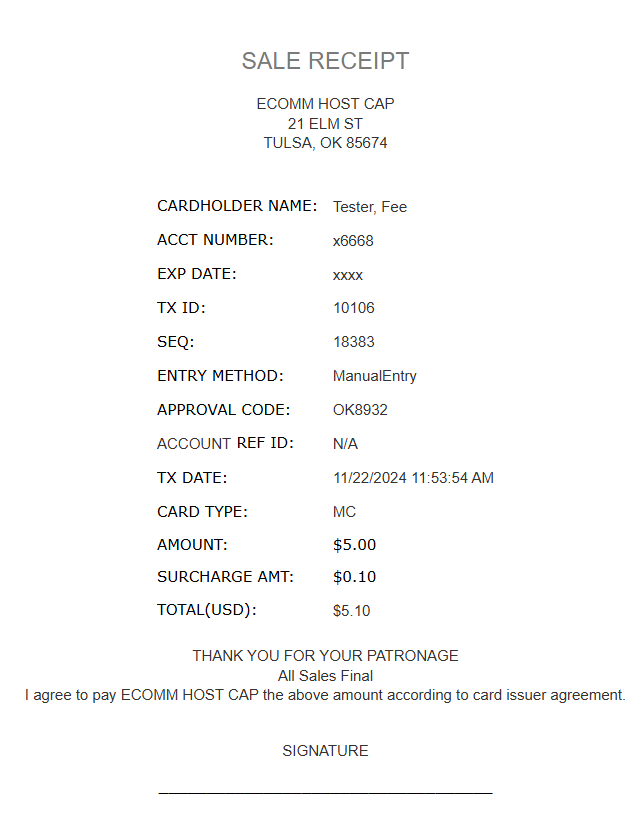 The customer’s receipt details the charge amounts including the base amount, fee, and total amount charged. Fee processing rules require that the fee amount is not hidden and is visible to the customer.