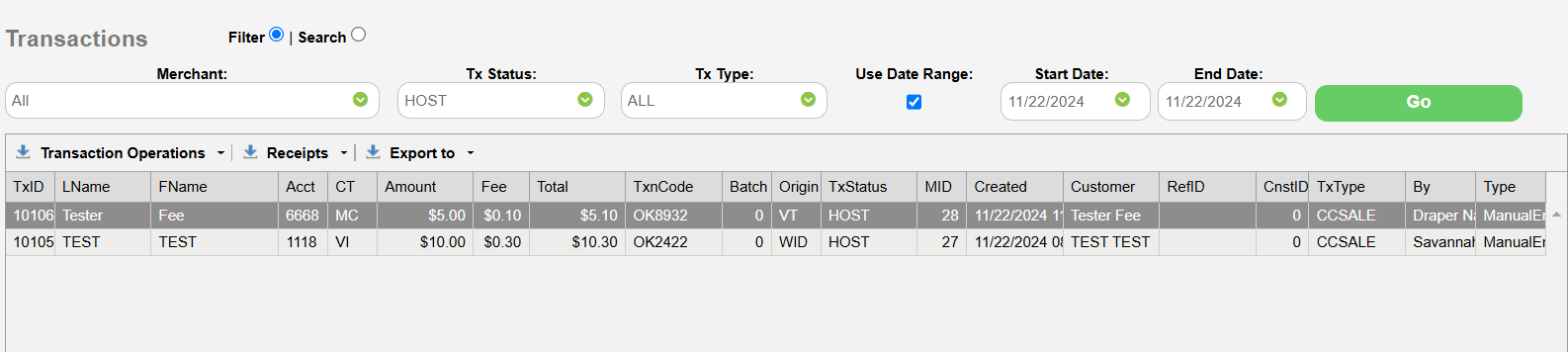 In addition to the receipts, the VT reporting and detail windows also show the fee structure as part of the total amount.